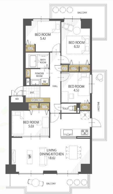 | 間取内容 | LDK18.6畳 1室  洋室5畳 1室  洋室4.5畳 1室  洋室6.5畳 1室  洋室5.4畳 1室 | ||