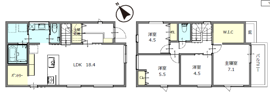 間取内容 LDK18.4畳 1階 1室  洋室7.1畳 2階 1室  洋室5.5畳 2階 1室  洋室4.5畳 2階 2室
