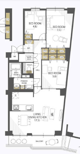 間取内容 LDK17.3畳 1室  洋室5.8畳 2室  洋室7.7畳 1室  洋室4.8畳 1室