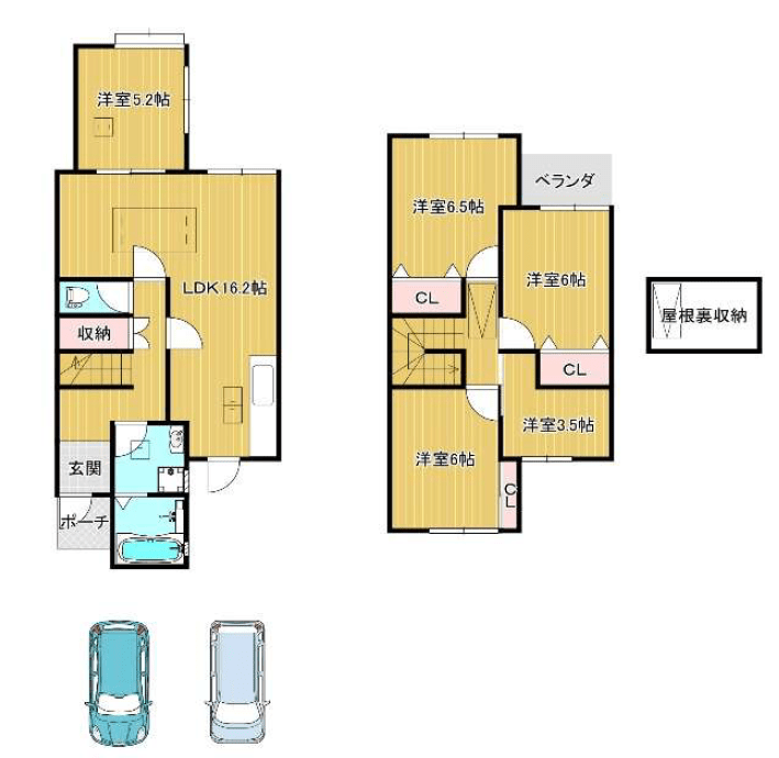 間取内容LDK16.2畳 1階 1室  洋室5.2畳 1階 1室  洋室6.5畳 2階 1室  洋室6畳 2階 2室  洋室3.5畳 2階 1室  S3階 1室